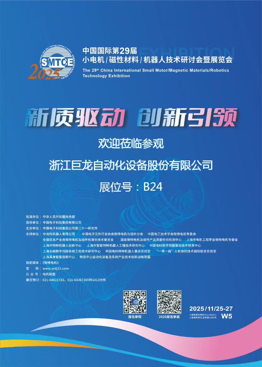 中國國際第29屆小電機、磁性材料、機器人技術研討會暨展覽會,浙江巨龍自動化設備股份有限公司 展會號:B24  歡迎蒞臨參觀!